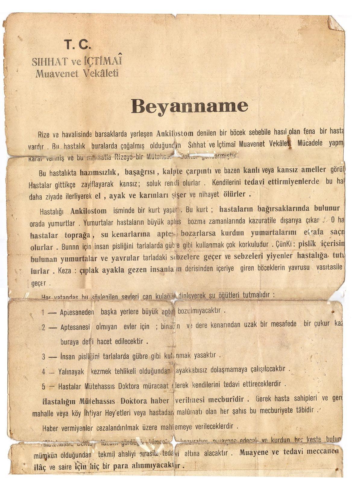 Cumhuriyetin ilk yıllarında Doğu Karadeniz’in Rize şehrinde ortaya çıkan salgın hastalıkların Rizelilerin başına dert olduğu ortaya çıktı. Öyle ki bu hastalıklardan biri olduğu ortaya çıkan ‘kancalı kurt hastalığı’ nedeniyle şehir merkezinde o dönem ayakkabısız gezmek yasaklandı. Dikkat çeken bu yasağın sebebi ise hastalığın köylerde gübreler nedeniyle bulaştıkları toprağa yalınayak basan vatandaşlar arasında yayılması oldu. Tedavi edilmediği takdirde karın şişliği ile başlayan bu hastalık, 3 yıl içerisinde de yakalanan kişinin ölümüne neden oluyordu. Bu nedenle dünyada 8 ülkede, Türkiye’de ise sadece Rize’de görülen bu hastalık için özel bir hastane kuruldu. Gazi Mustafa Kemal Atatürk’ün de doktoru olan Doktor Asım Arar’ın hazırladığı rapor neticesinde şehirde ayakkabısız gezme yasağı dışında da bazı yasaklar uygulandı. Bu yasaklardan birisi tedavi zorunluluğu, diğeri ise hastalığa yakalanıp tedavi olmayanı söyleme zorunluluğu idi. Ayrıca bu hastalığa yakalananların tedavisi için gerekli ilaçların Rize’de kurulan Kancalı Kurt Hastalığı Hastanesinde o dönemde ücretsiz dağıtıldığı öğrenildi.